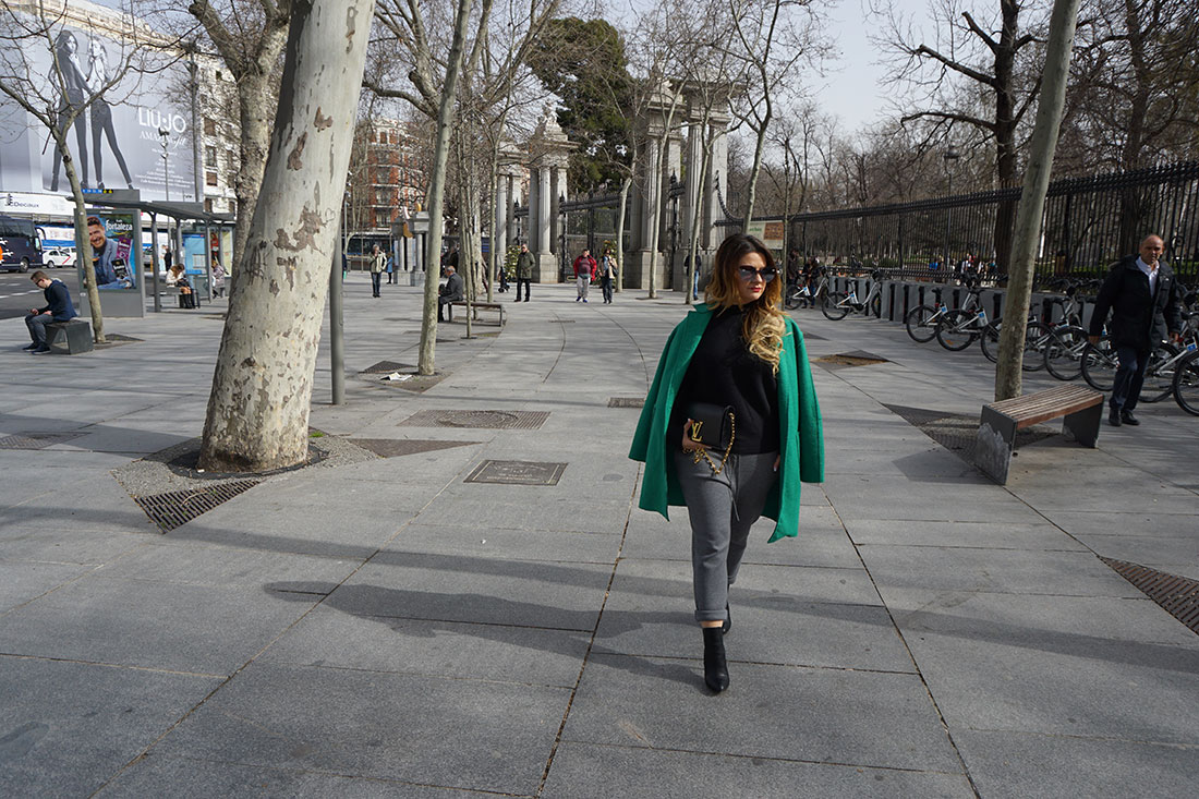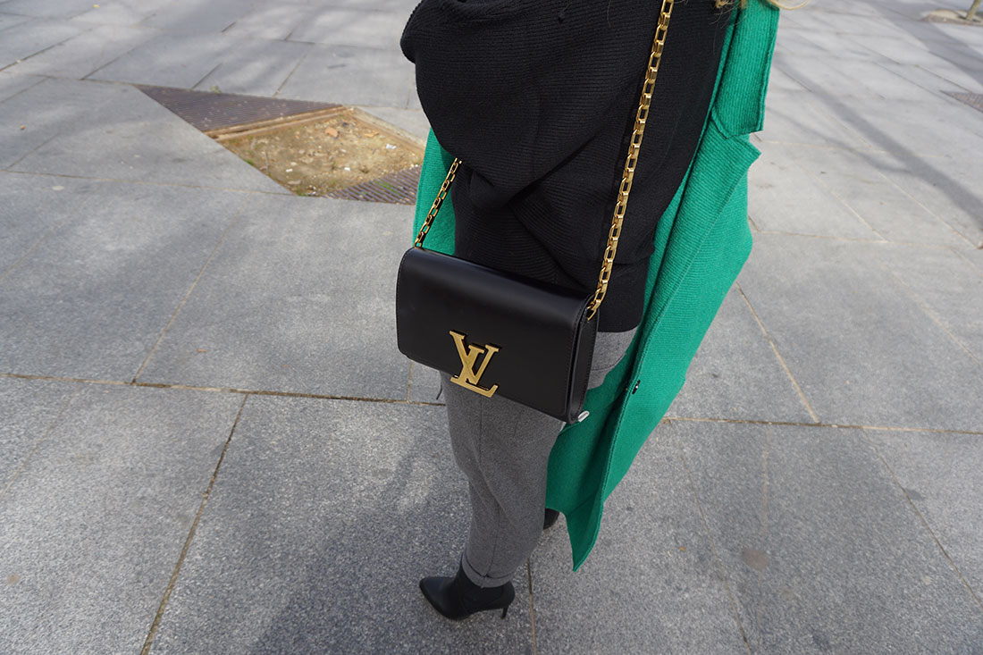 I have chosen a very comfortable look combining jogging pants and a knit sweater. Boots and my inseparable LOUIS VUITTON bah. Everything in neutral colors to leave absolute protagonism to this green coat that you already know of other posts!